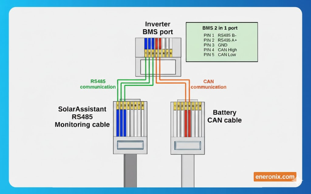 1. Protocol selection mismatch: Inverter battery type setting must match BMS protocol exactly. Generic “Lithium” setting might use voltage only control (no CAN communication). “Pylontech” or “CAN” setting enables CAN protocol parsing. Exact name matters: “Pylontech” is not equal to “Pylontech CAN” is not equal to “CAN Protocol” on some inverters.
